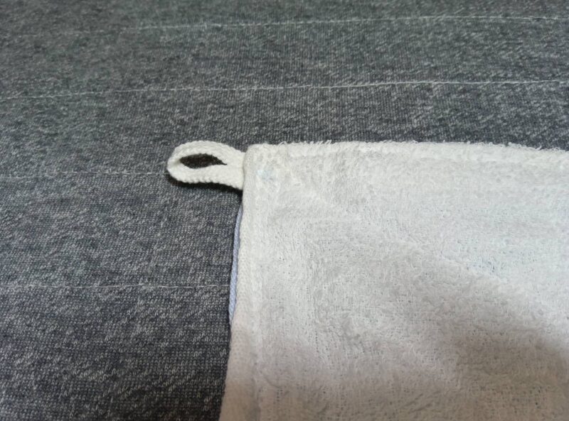 ・ループひもを半分(はんぶん)に折って、ぞうきんの縫い代(ぬいしろ)カドに挟(はさ)み込(こ)み、手でズレないように押さえます