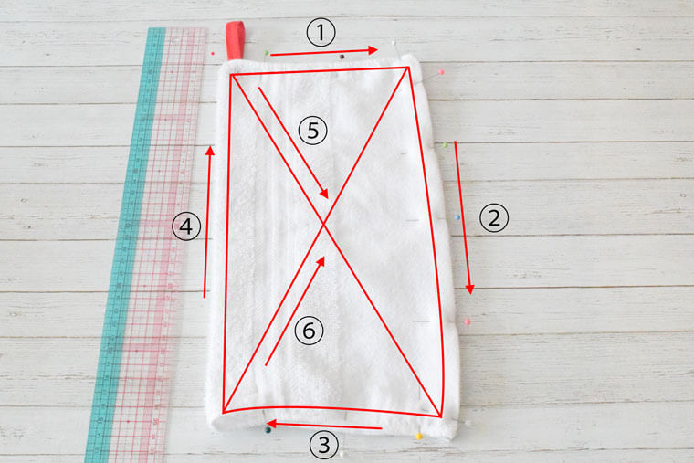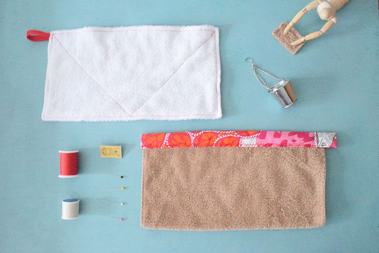 ・二重(にじゅう)に折(お)りたたむので、分厚くないタオル生地(きじ)のほうが、縫いやすいと思います
